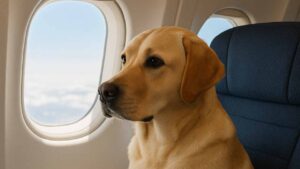cane Labrador seduto su sedile di aereo di linea - fonte_AI - Madonienotizie.it Enac aggiorna le regole: cani di taglia...